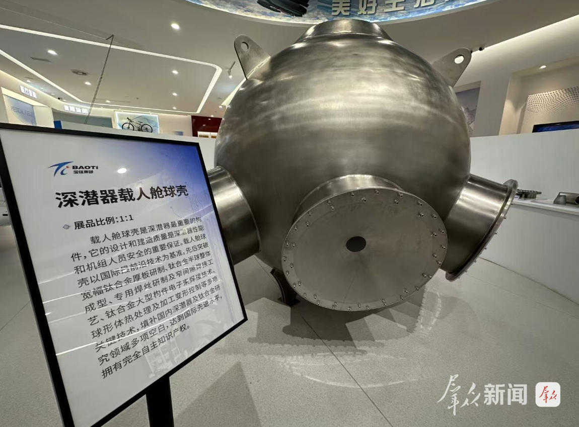 9月23日,走進寶鈦集團,展覽館內碩大的深潛器載人艙球殼模型將時間線拉回5年前。2020年11月,裝有寶鈦研制生產的鈦合金載人球艙的“奮斗號”載人潛水器在馬里亞納海溝成功坐底10909米,創(chuàng)造我國載人深潛的新紀錄。