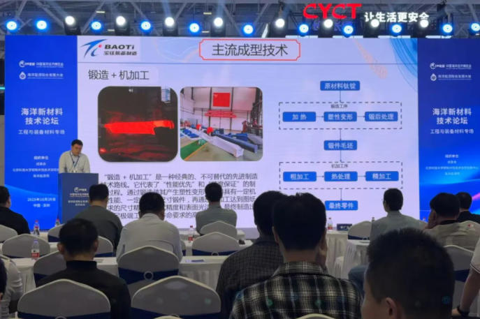 展會期間,寶鈦股份營銷部門與寶鈦研究院專家團(tuán)隊緊密配合,為來自全球的海洋裝備制造商及科研機(jī)構(gòu)提供從技術(shù)咨詢到商務(wù)洽談的一站式專業(yè)服務(wù)。在“海洋新材料技術(shù)論壇——工程與裝備材料專場”上,裝備制造公司趙彤作專題技術(shù)報告,分享了寶鈦在高端裝備材料應(yīng)用方面的最新研究成果。