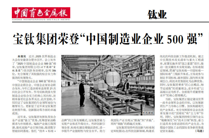 近日,2025世界制造業(yè)大會在安徽省合肥市召開。會上發(fā)布了“2025中國制造業(yè)企業(yè)500強”榜單,寶鈦集團有限公司(以下簡稱“寶鈦集團”)首次躋身該榜單,位列386位,充分展現了其較強的綜合實力和強勁的發(fā)展勢頭。
