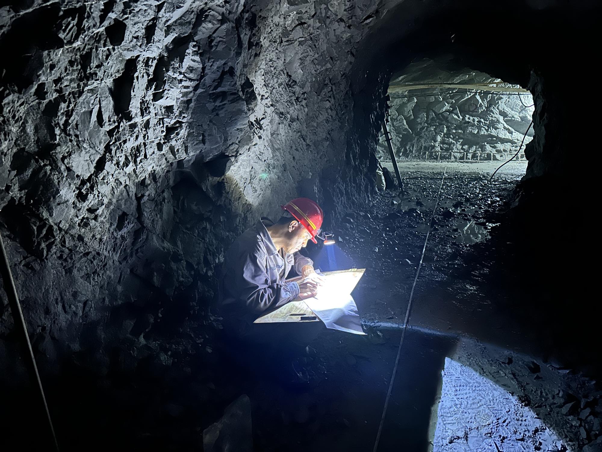 山陽(yáng)縱橫礦業(yè)的地質(zhì)技術(shù)服務(wù)合同還未敲定,但礦山生產(chǎn)不能等。這一周成了與時(shí)間的搶奪戰(zhàn),每日晨光稀薄時(shí),頭燈便已劃破礦井幽深的黑暗。地下分不清晝夜,只有巖壁滲水單調(diào)的滴答聲作伴。我們弓身在水汽彌漫的巷道里穿行,好不容易找到片稍干爽的地方,剛攤開(kāi)素描紙,水痕又暈染了墨線。我們的地質(zhì)編錄工作常與坑道施工“撞車”,遠(yuǎn)處不時(shí)傳來(lái)悶雷般的爆破聲,震得心口發(fā)麻,防塵口罩混著水汽堵在鼻腔,讓人更加煩躁。