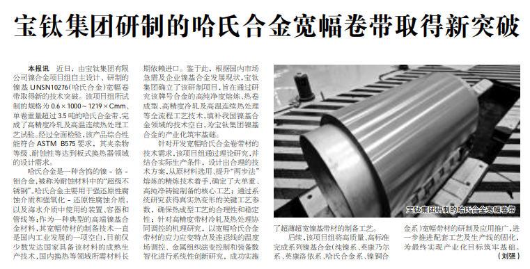 近日,由寶鈦集團鎳合金項目組自主設(shè)計、研制的鎳基UNSN10276(哈氏合金)寬幅卷帶取得新的技術(shù)突破。他們所試制的規(guī)格為0.6×1000~1219×Cmm、單卷重量超過3.5噸的哈氏合金帶,完成了高精度冷軋及高溫連續(xù)熱處理工藝試驗。經(jīng)過全面檢驗,產(chǎn)品綜合性能符合ASTM B575要求,其夾雜物等級、耐蝕性、冷深沖壓型等達到板式換熱器領(lǐng)域的設(shè)計需求。