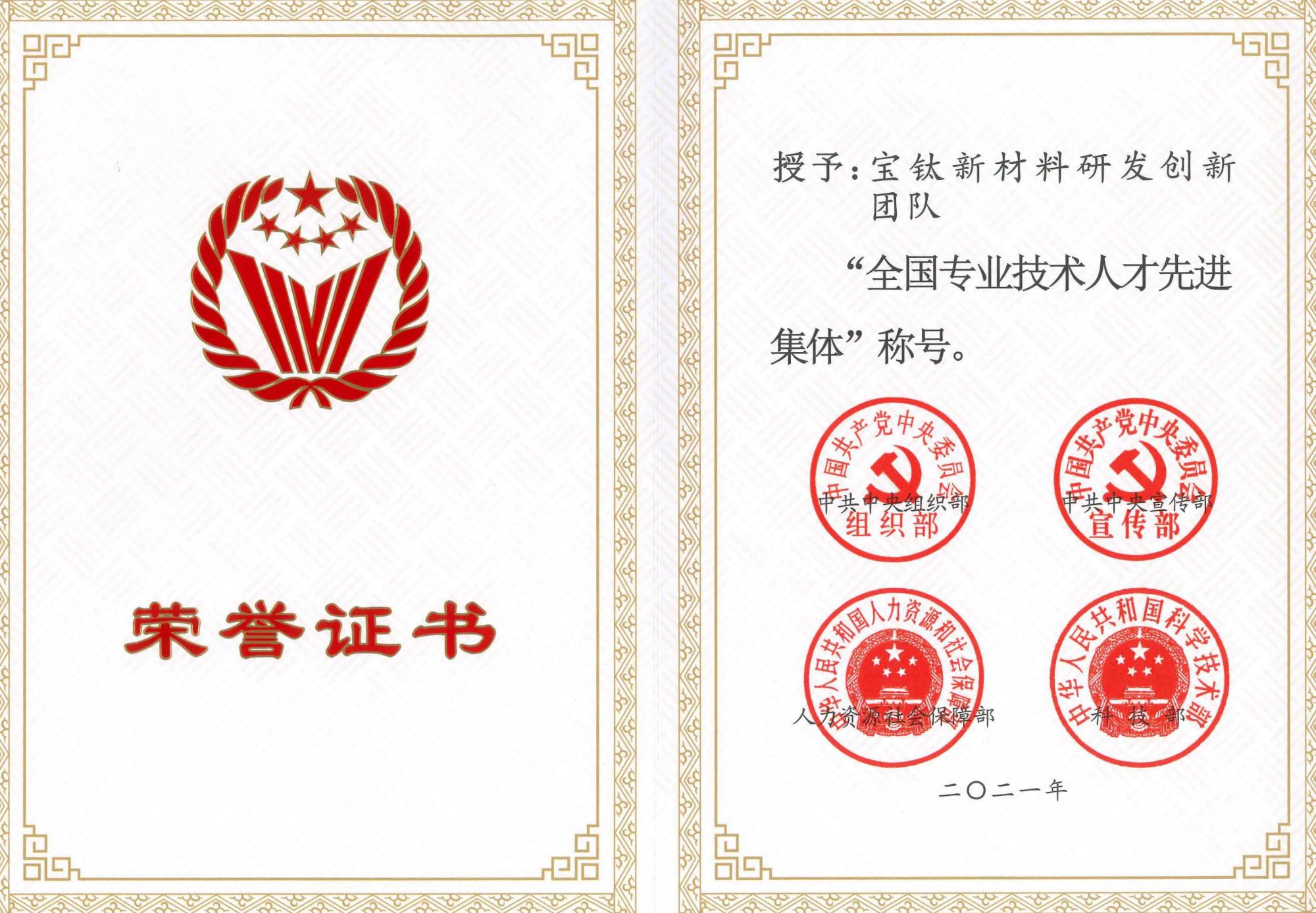 全國杰出專業(yè)技術人才及集體評選表彰由中共中央組織部、中共中央宣傳部、人力資源社會保障部、科技部聯(lián)合組織實施,每5年開展一次。此次獲得表彰的全國專業(yè)技術人才先進集體同時有鐘南山呼吸疾病防控團隊、殲-15飛機研制團隊等杰出人才集體,均為我國廣大專業(yè)技術人才的優(yōu)秀代表。2021年5月,在省人社廳、省國資委大力支持下,由陜西有色金屬集團組織申報,寶鈦新材料研發(fā)創(chuàng)新團隊與全省眾多優(yōu)秀企業(yè)科研團隊同臺競爭,經(jīng)過艱苦努力,沖出重圍,取得代表全省企業(yè)參與國家評選的唯一名額,最終在國家四部委聯(lián)合評選中脫穎而出。