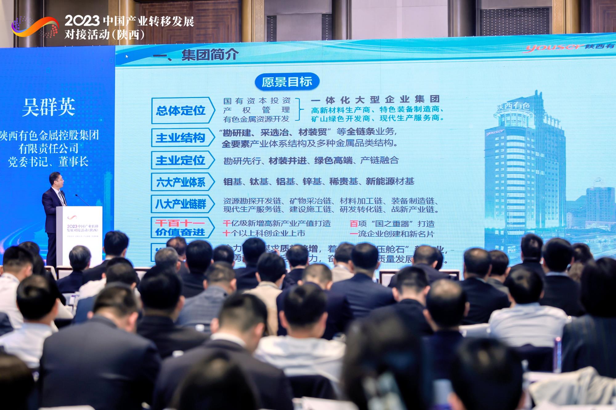 2023年11月19日,在中國產(chǎn)業(yè)轉(zhuǎn)移發(fā)展對接活動上,集團公司黨委書記、董事長吳群英作產(chǎn)業(yè)推介。