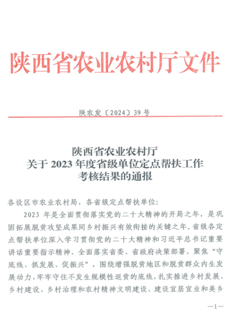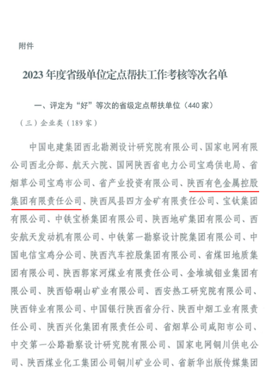 近日,陜西省農(nóng)業(yè)農(nóng)村廳印發(fā)《關(guān)于2023年度省級(jí)單位定點(diǎn)幫扶工作考核結(jié)果的通報(bào)》(陜農(nóng)發(fā)〔2024〕39號(hào)),對(duì)2023年度全省定點(diǎn)幫扶工作考核結(jié)果進(jìn)行通報(bào),陜西有色金屬集團(tuán)被評(píng)為省級(jí)定點(diǎn)幫扶“好”等次單位,在進(jìn)入鞏固脫貧攻堅(jiān)成果同鄉(xiāng)村振興有效銜接期連續(xù)三年獲此殊榮。