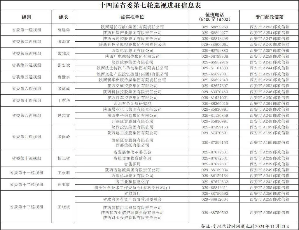 經(jīng)省委批準(zhǔn),13個巡視組對省發(fā)展和改革委員會、省財政廳、省委科學(xué)技術(shù)工作委員會(省科學(xué)技術(shù)廳)、省工業(yè)和信息化廳、省政府國有資產(chǎn)監(jiān)督管理委員會、陜西延長石油(集團)有限責(zé)任公司、陜西煤業(yè)化工集團有限責(zé)任公司、陜西投資集團有限公司、陜西有色金屬控股集團有限責(zé)任公司、陜西建工控股集團有限公司、陜西醫(yī)藥控股集團有限責(zé)任公司、西部機場集團有限公司、陜西文化產(chǎn)業(yè)投資控股(集團)有限公司、陜西旅游集團有限公司、西部電影集團有限公司、陜西廣電融媒體集團有限公司、陜西新華出版?zhèn)髅郊瘓F有限責(zé)任公司、西北有色金屬研究院、陜西科技控股集團有限責(zé)任公司、陜西省物流集團有限責(zé)任公司、陜西交通控股集團有限公司、陜西電子信息集團有限公司、陜西汽車控股集團有限公司、陜西法士特汽車傳動集團有限責(zé)任公司等24家單位黨組(黨委)開展常規(guī)巡視;對省能源局、省糧食和物資儲備局、陜西環(huán)保產(chǎn)業(yè)集團有限責(zé)任公司等3家單位黨組(黨委)開展提級巡視;對省財政廳下屬的陜西省信用再擔(dān)保有限責(zé)任公司、陜西省農(nóng)業(yè)信貸融資擔(dān)保有限公司、陜西財金投資管理有限責(zé)任公司,陜西煤業(yè)化工集團有限責(zé)任公司下屬的開源證券股份有限公司,陜西投資集團有限公司下屬的西部證券股份有限公司、西部信托有限公司等6家金融企業(yè)黨委進(jìn)行專題了解。