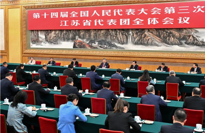 在聽取大家發(fā)言后,習(xí)近平作了發(fā)言。他首先表示贊成政府工作報告,對江蘇工作予以肯定,希望江蘇落實好挑大梁的責(zé)任,努力取得新的更大成績。