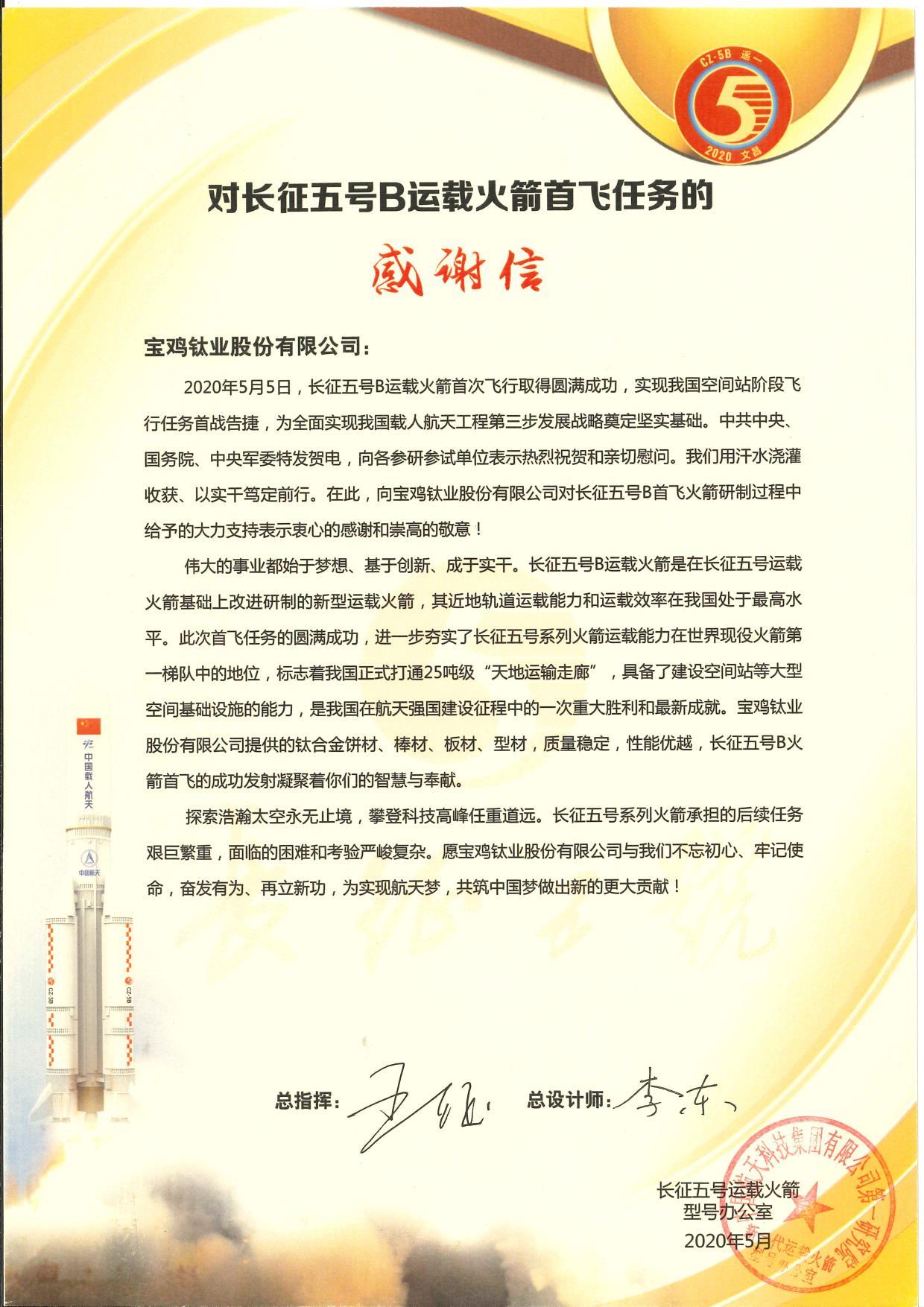 近日,寶鈦股份收到長(zhǎng)征五號(hào)B運(yùn)載火箭首飛任務(wù)的感謝信。寶鈦股份為長(zhǎng)征五號(hào)B運(yùn)載火箭提供的鈦合金餅材、棒材、板材、型材,質(zhì)量穩(wěn)定,性能優(yōu)越,受到客戶極大的肯定。