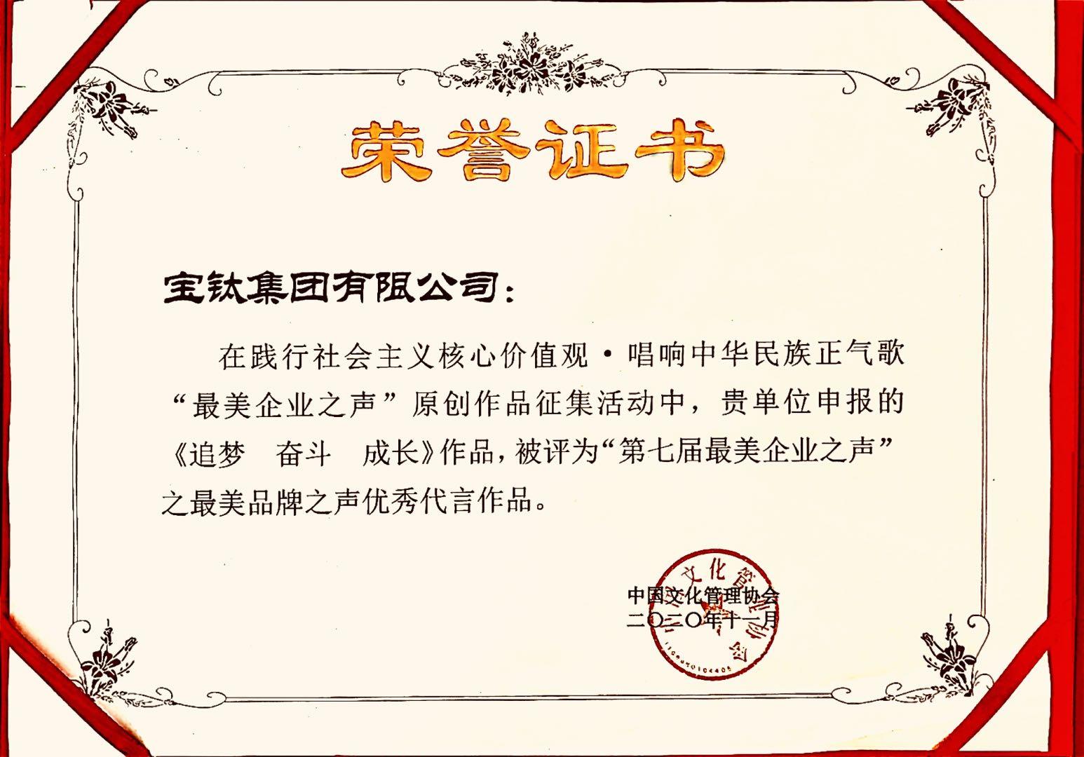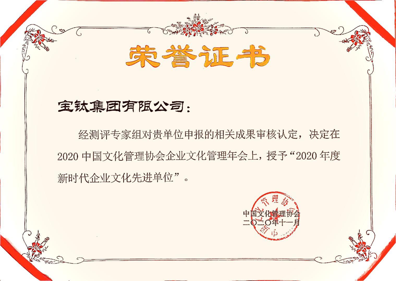 11月19日至20日,在廣州召開的“構(gòu)建新發(fā)展格局,激發(fā)新發(fā)展活力”2020中國文化管理協(xié)會(huì)企業(yè)文化管理年會(huì)上,寶鈦集團(tuán)被評(píng)為“新時(shí)代企業(yè)文化先進(jìn)單位”,公司原創(chuàng)微視頻《追夢(mèng) 奮斗 成長(zhǎng)》獲“最美品牌之聲優(yōu)秀代言作品”。 來自政府有關(guān)部門的領(lǐng)導(dǎo)、各界專家學(xué)者、各企事業(yè)會(huì)員單位代表共600余人參加了本屆年會(huì)。