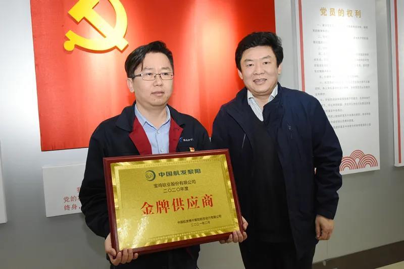 3月10日,在寶鈦股份與中國航發(fā)黎陽動力黨建共建活動啟動儀式上,中國航發(fā)黎陽動力黨委副書記、工會主席呂蓬向?qū)氣伖煞蓊C發(fā)了2020年度“金牌供應(yīng)商”榮譽獎牌。作為其鈦材供應(yīng)戰(zhàn)略合作供應(yīng)商,寶鈦股份已連續(xù)三年獲此殊榮。