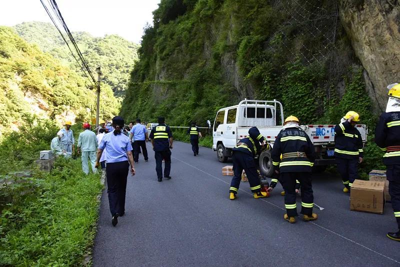 此次演練模擬場景為:受連續(xù)降雨影響,16時(shí)15分,寶鈦集團(tuán)老區(qū)進(jìn)山公路二號橋附近山體滑坡,滾石導(dǎo)致交通中斷。板材廠客貨車途經(jīng)該路段時(shí)被滾石砸中,車輛受損,駕駛員受傷。