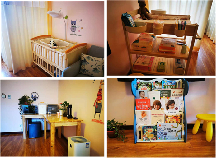“母嬰關(guān)愛室”設(shè)施齊全、溫馨舒適。室內(nèi)為孕期、哺乳期女職工提供了嬰兒護(hù)理臺、嬰兒床、吸乳器、紫外線消毒燈、奶瓶蒸汽消毒鍋、應(yīng)急醫(yī)療包、飲水機(jī)、電視機(jī)、電冰箱、空調(diào)、空氣凈化器等設(shè)備;哺乳、護(hù)理、沖奶、休息等功能區(qū)相對獨(dú)立;尿不濕、嬰兒玩具、踩腳凳等物品應(yīng)有盡有;裝修建材綠色環(huán)保,家居建材質(zhì)量過關(guān),并由專人負(fù)責(zé)日常管理和物品清潔消毒;提供多種育兒書籍、專業(yè)育兒視頻,便于女職工在閑暇時查閱學(xué)習(xí)。