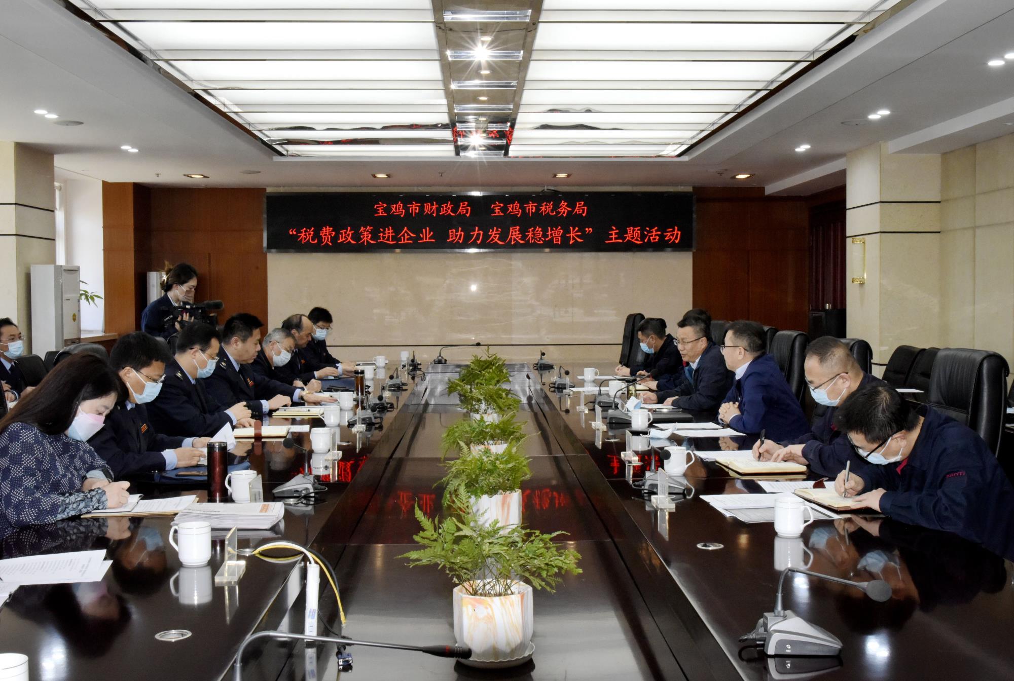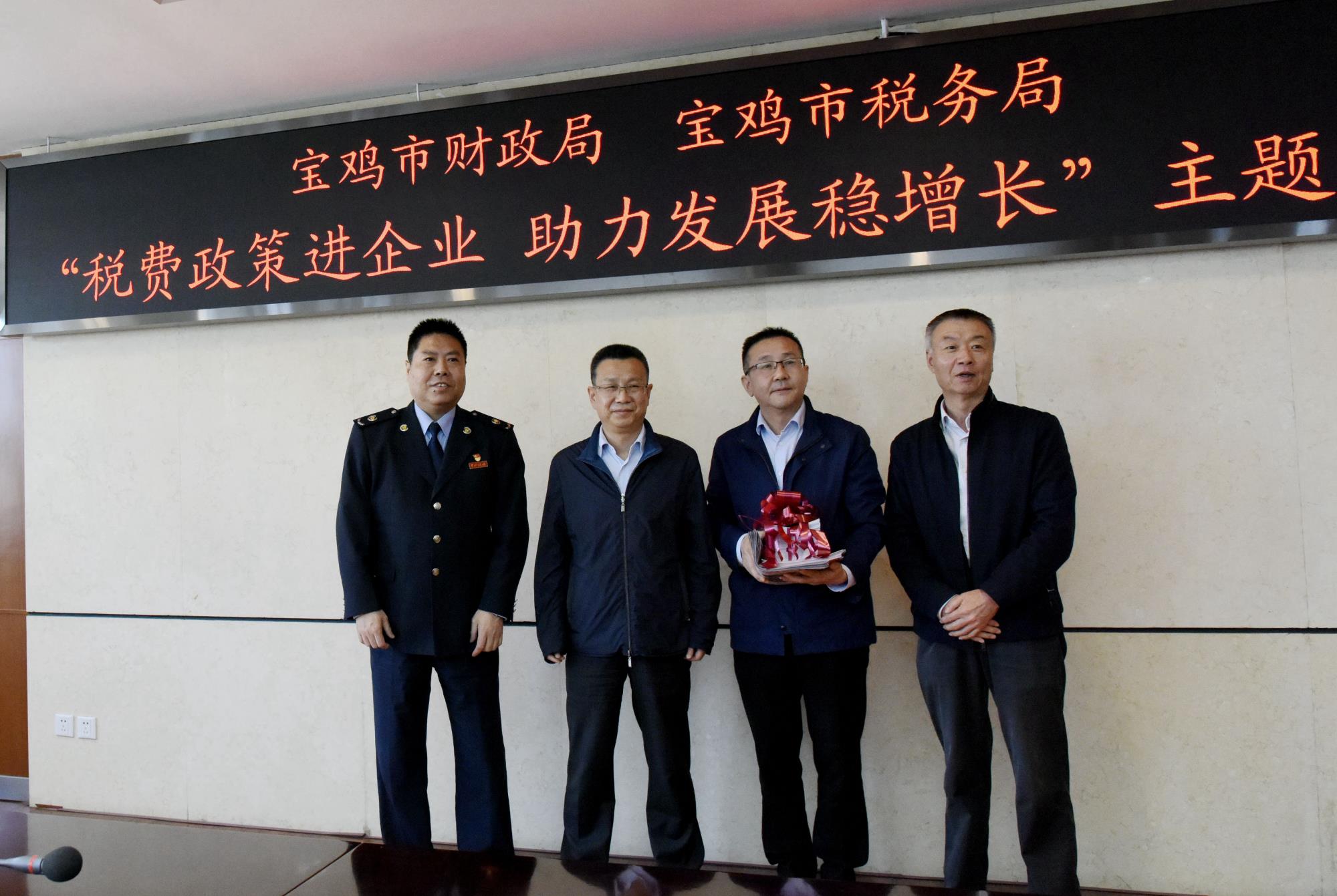 4月25日,寶雞市市稅務(wù)局黨委書(shū)記、局長(zhǎng)程濤,市財(cái)政局黨組成員、副局長(zhǎng)張曄平一行來(lái)到寶鈦集團(tuán),開(kāi)展“稅費(fèi)政策進(jìn)企業(yè) 助力發(fā)展穩(wěn)增長(zhǎng)”主題活動(dòng)。寶鈦集團(tuán)黨委副書(shū)記、總經(jīng)理雷讓岐,總會(huì)計(jì)師余和明及相關(guān)部門負(fù)責(zé)人參加活動(dòng)。