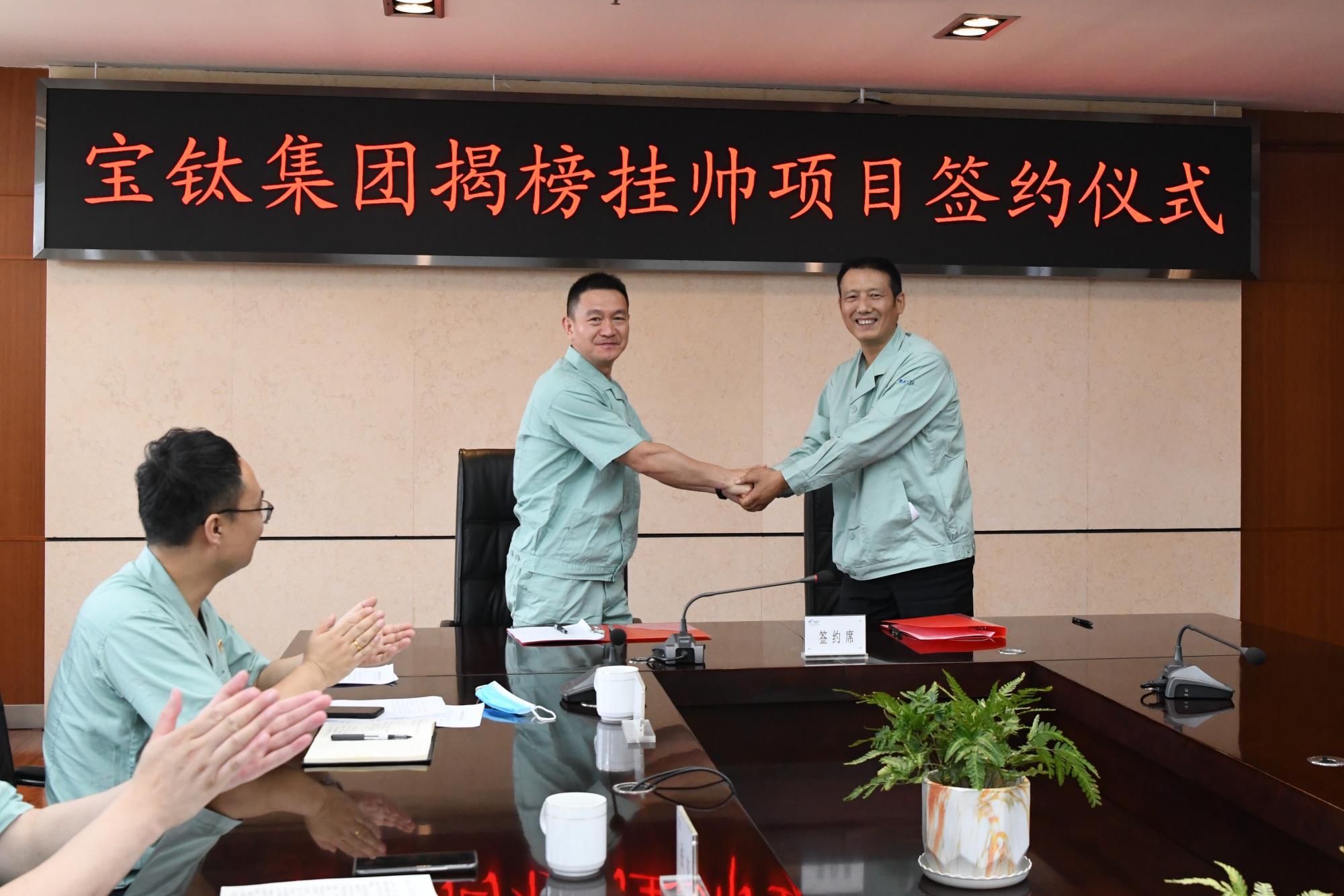 近日,寶鈦集團(tuán)黨委按照陜西有色金屬集團(tuán)黨委《關(guān)于開展“揭榜掛帥”活動(dòng)試點(diǎn)工作的通知》精神,在機(jī)關(guān)九樓會(huì)議室舉行了“航天航空緊固件用TC4、TC16鈦合金大單重盤圓絲材研制”項(xiàng)目簽約儀式。寶鈦集團(tuán)黨委副書記、總經(jīng)理、活動(dòng)領(lǐng)導(dǎo)小組組長雷讓岐主持儀式并講話。公司副總經(jīng)理、活動(dòng)領(lǐng)導(dǎo)小組副組長、工作專班負(fù)責(zé)人王儉與揭榜成功的團(tuán)隊(duì)負(fù)責(zé)人、線材廠廠長陶海林簽訂協(xié)議書。