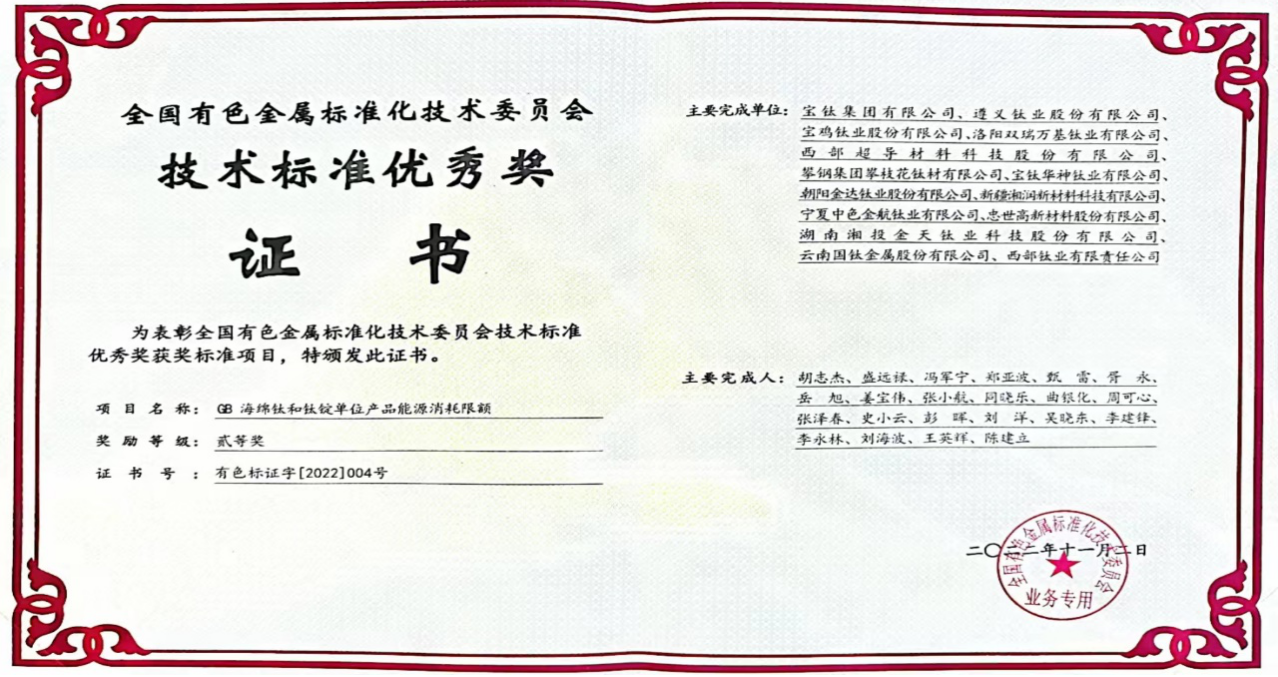 近日,2022年度全國(guó)有色金屬標(biāo)準(zhǔn)化技術(shù)委員會(huì)年會(huì)發(fā)布了全國(guó)有色金屬領(lǐng)域技術(shù)標(biāo)準(zhǔn)獲獎(jiǎng)名單。由寶鈦集團(tuán)主持制定的強(qiáng)制性國(guó)家標(biāo)準(zhǔn)《海綿鈦和鈦錠單位產(chǎn)品能源消耗限額》榮獲“全國(guó)有色金屬標(biāo)準(zhǔn)化技術(shù)委員會(huì)技術(shù)標(biāo)準(zhǔn)優(yōu)秀獎(jiǎng)”。