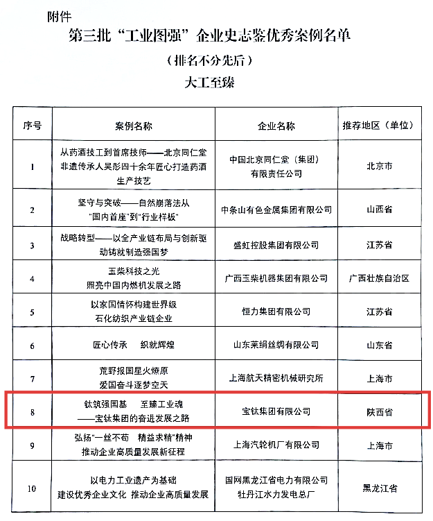 近日,寶鈦集團(tuán)成功入選工信部工業(yè)文化發(fā)展中心第三批“工業(yè)圖強(qiáng)”企業(yè)史志鑒優(yōu)秀案例名單。