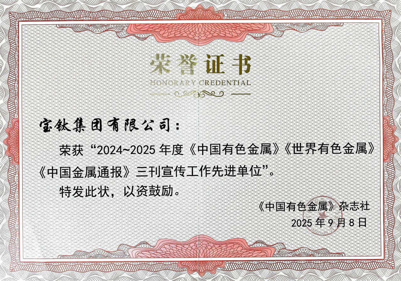 在9月18日至19日召開的第26屆《中國有色金屬》《世界有色金屬》《中國金屬通報》三刊特約通訊員暨《中國有色金屬工業(yè)年鑒》撰稿人工作會議上,寶鈦集團榮獲2024——2025年度“三刊”宣傳工作先進單位稱號。