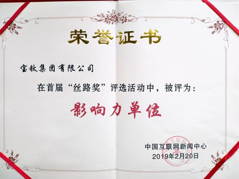 近日,寶鈦集團(tuán)在中國(guó)互聯(lián)網(wǎng)新聞中心(中國(guó)網(wǎng))舉辦的首屆“絲路獎(jiǎng)”評(píng)選活動(dòng)中,榮獲“絲路獎(jiǎng)?影響力單位”稱號(hào)。