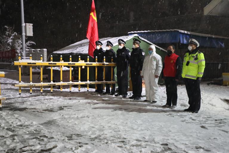 風(fēng)雪中堅守保家園。2月5日晚,金堆礦區(qū)氣溫驟降,雪花飄飄,寒風(fēng)襲人。金堆礦區(qū)抗擊新型冠狀肺炎的六個檢查站、48個勸導(dǎo)點的同志不畏嚴寒不畏風(fēng)雪,依然堅守在自己的崗位上。