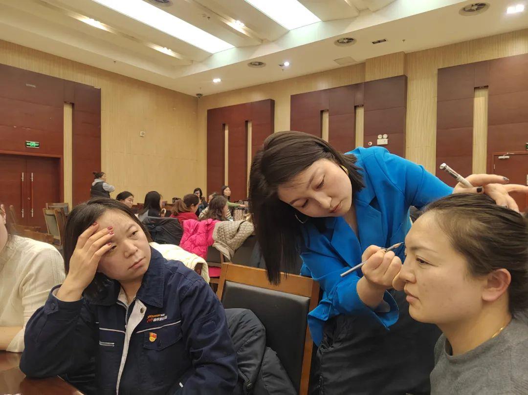 實(shí)操伊始,化妝老師挑選了一位女職工充當(dāng)模特進(jìn)行上臺試裝,根據(jù)模特儀容儀表現(xiàn)場教學(xué),并通過互動(dòng)的方式耐心細(xì)致地對各個(gè)化妝環(huán)節(jié)一一講解。示范完畢后,在一陣陣的驚嘆聲中,大家躍躍欲試,對著鏡子“活學(xué)活用”,在自行化妝或彼此化妝的道路上愈發(fā)明快。期間,化妝老師不停地穿梭在女工們身邊,手把手地教大家化妝的技巧和要領(lǐng),用簡單明了的方法將專業(yè)的化妝知識生活化、具象化,使得女工們快速的了解和掌握了化妝的基本要領(lǐng)。活動(dòng)最后,化妝師貼心安排了修眉環(huán)節(jié),根據(jù)各位女工臉型精心修剪眉形,為女工送去最美的祝福。