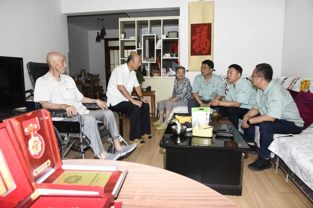慰問中,賀治民代表集團向劉兆華致以崇高敬意,并祝他身體康健、幸福安康。劉兆華家人深情回憶了老人抗戰(zhàn)的烽火歲月和退伍后扎根寶鈦默默奉獻的工作經(jīng)歷,并表示感謝企業(yè)的長期關懷,既讓老人感受到了組織的溫暖,也讓后輩更加堅定了傳承紅色基因、感恩回饋企業(yè)社會的信念。